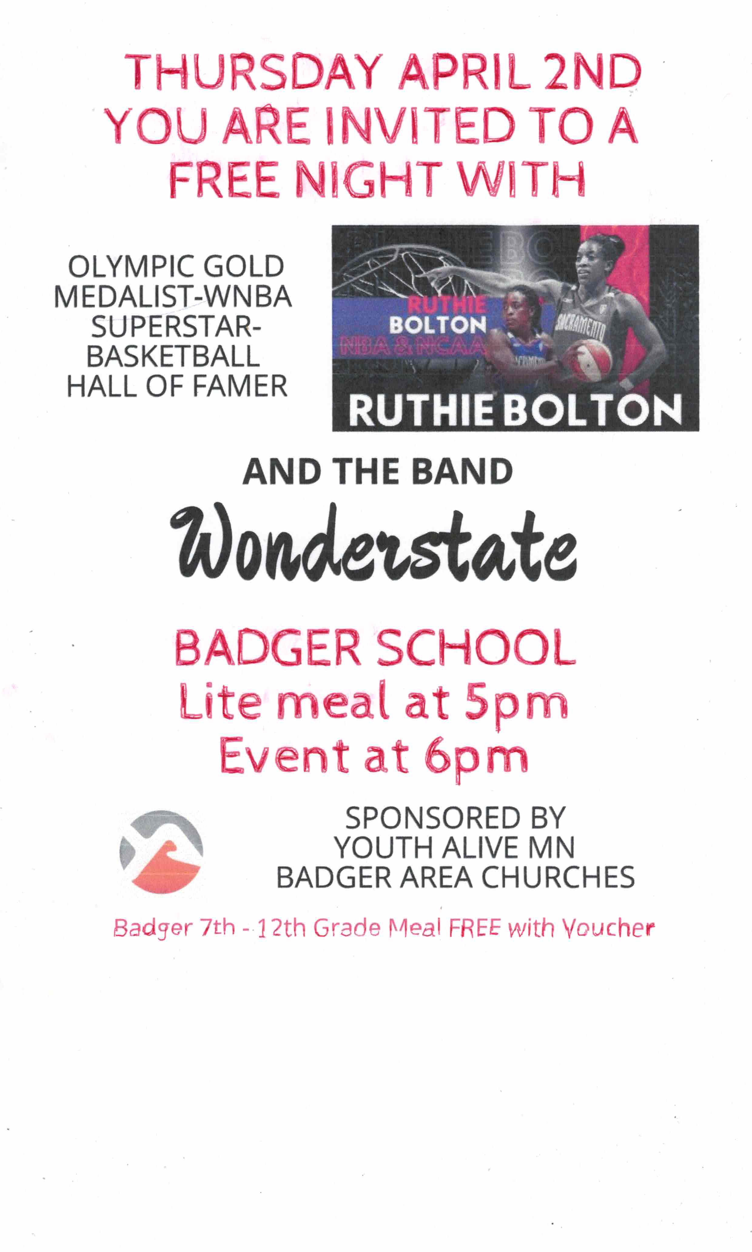 Meal 5pm, Event 6pm. Ruthie Bolton & Wonderstate Band. @Badger School